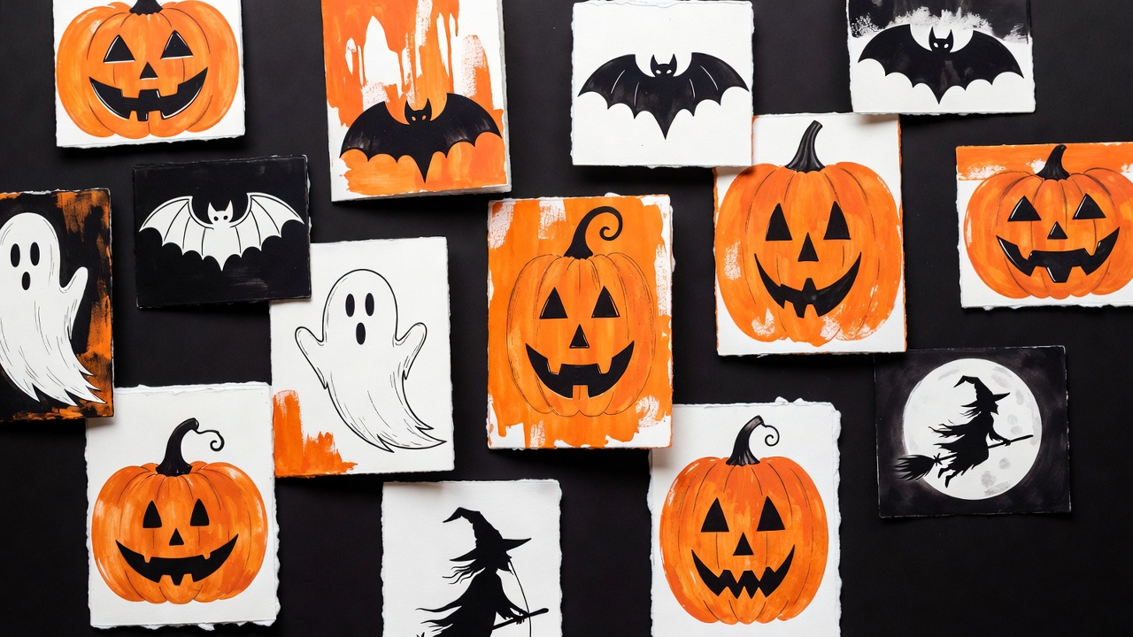 Halloween art, Halloween decorations, October, autumn, bats, black background, broomstick, carved pumpkins, clipart, collage, festive, friendly ghosts, ghosts, holiday, illustration, isolated, jack-o-lantern, orange, painted cards, pumpkins, spooky, vibrant colors, white borders, witch, Halloween
