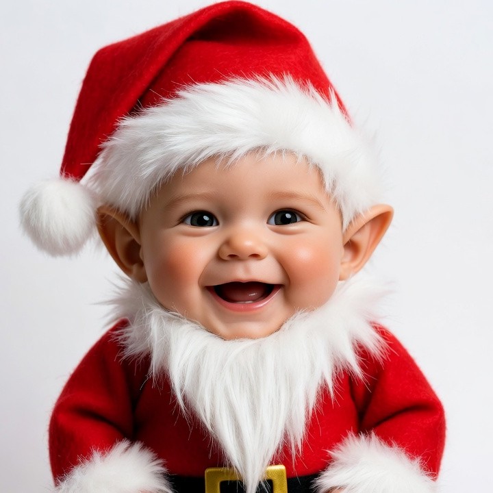 Christmas costume, Santa Claus, Santa hat, big eyes, black belt, boy, cute baby, elf ears, fair skin, fluffy beard, happy baby, holiday costume, infant, isolated background, joyful expression, portrait, red outfit, smiling baby, white fur trim, baby