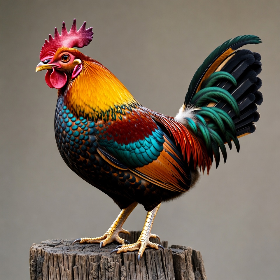 animal portrait, bird, chicken, colorful rooster, farm animal, golden feathers, iridescent feathers, isolated background, poultry, red comb, standing rooster, tail feathers, vibrant colors, wooden stump, rooster
