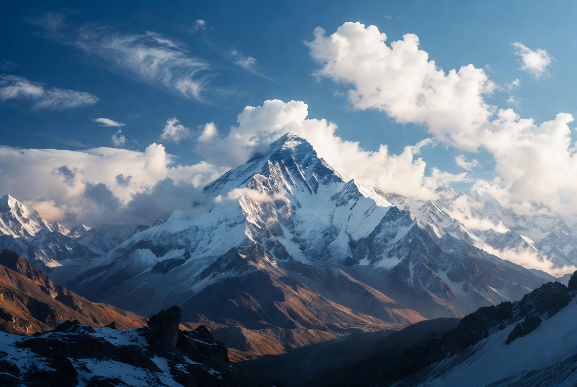 Everest, Himalayas, alpine landscape, blue sky, cloud shrouded, clouds, dramatic sky, glacier, high altitude, majestic peak, mountain range, peak, rocky slopes, rugged terrain, snow, snowy mountain, summit, white clouds, winter mountains, Mount Everest