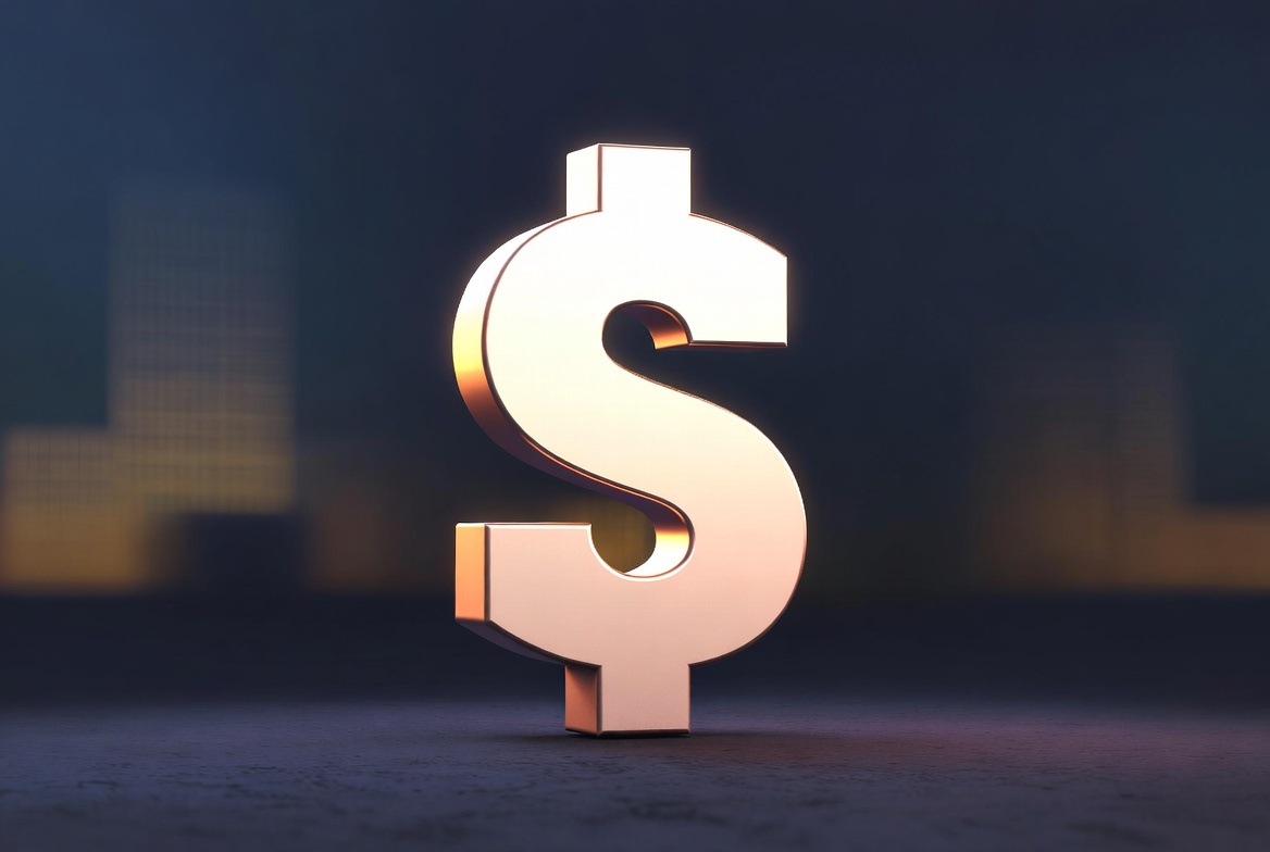 A large three-dimensional golden dollar sign stands prominently in the foreground. It glows with a metallic shine against a dark background featuring blurred city buildings at night.