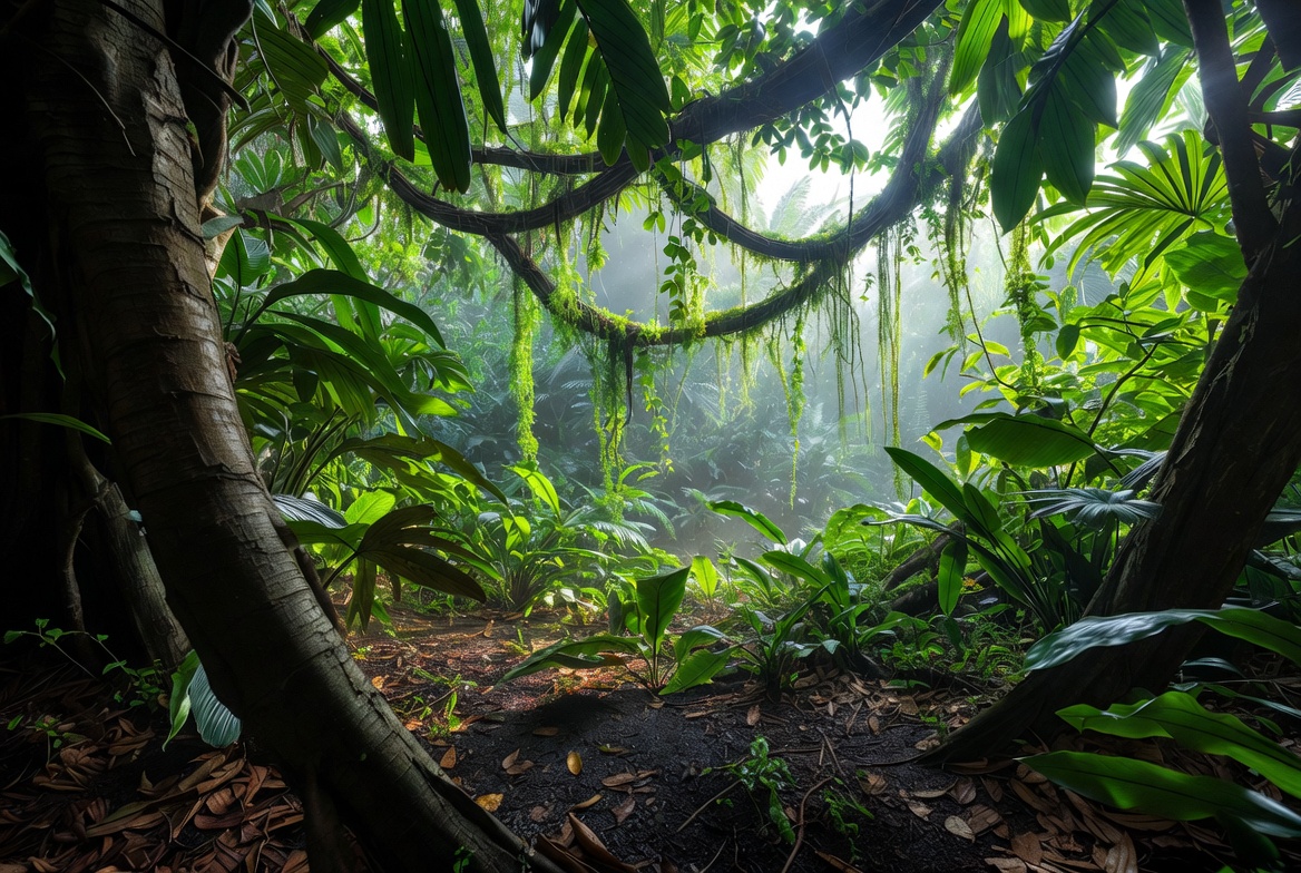 broadleaf plants, canopy, dense vegetation, exotic jungle, ferns, foliage, forest floor, green leaves, green vines, hanging vines, humid forest, leaf litter, lush foliage, misty atmosphere, mossy trees, palm leaves, rainforest, sunlight rays, tree trunks, tropical forest, tropical plants, undergrowth, verdant jungle, wild nature, wilderness, jungle