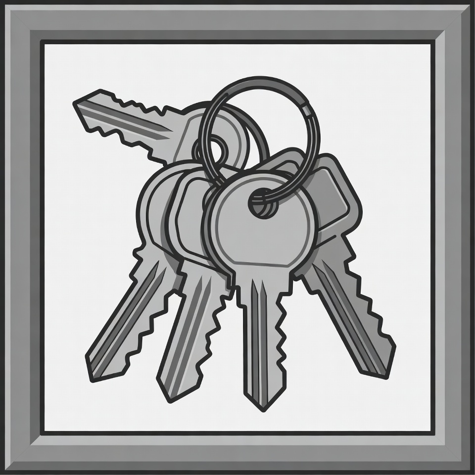 car keys, clipart, gray frame, grayscale, house keys, illustration, isolated background, key chain, keyring, line art, metal keys, multiple keys, simple drawing, vector art, white background, keys