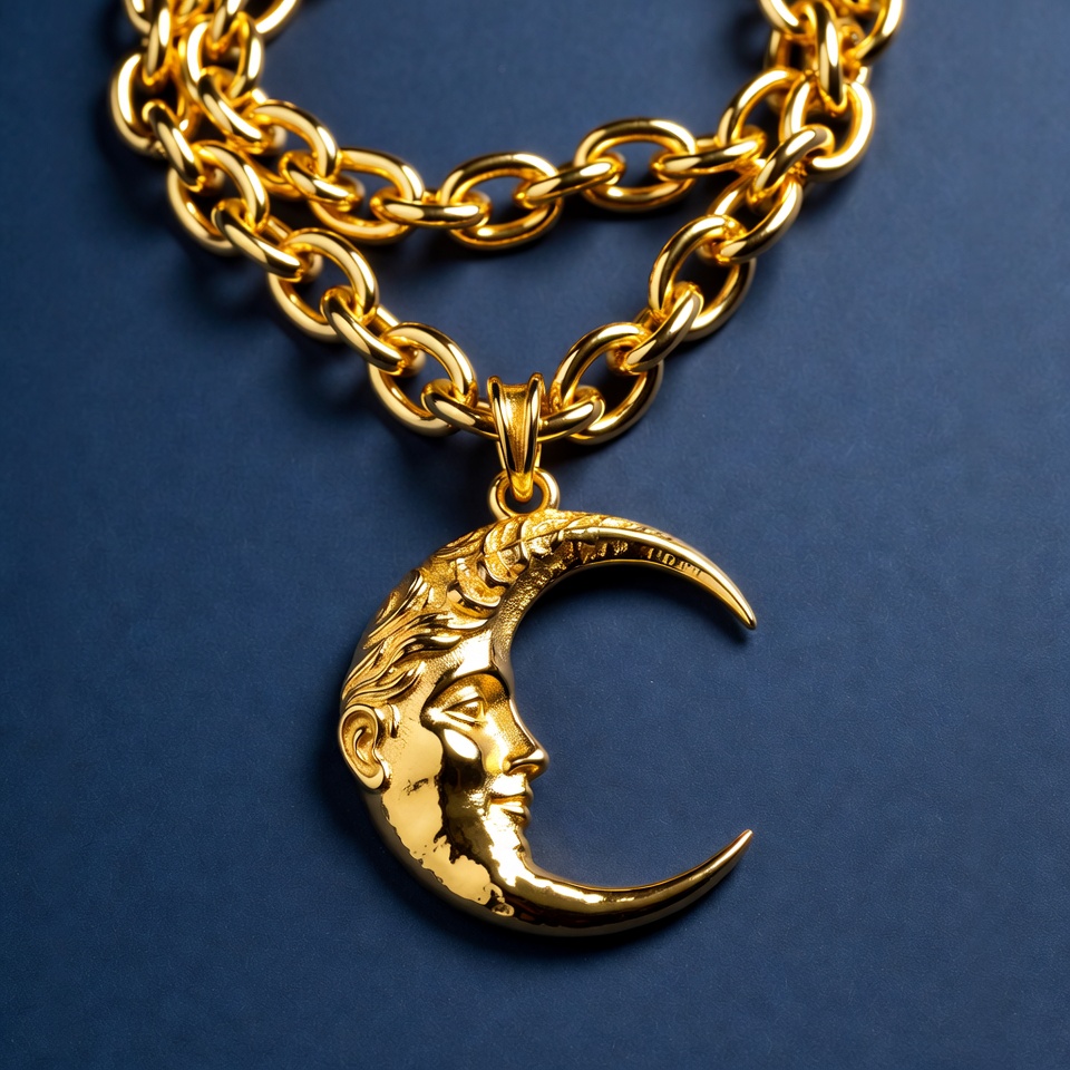 chain necklace, crescent moon, detailed moon, fashion accessory, gold chain, gold jewelry, isolated background, jewelry, jewelry design, luxury jewelry, moon face, moon necklace, moon pendant, necklace, ornate pendant, pendant, thick chain, gold necklace