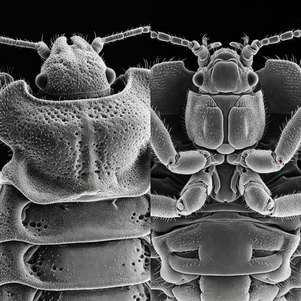 Scanning electron microscope image shows two bedbugs in side-by-side views. The left bedbug displays dorsal and ventral details with visible segmentation and fine hairs. The right bedbug highlights anterior head, legs, and body structures in high detail.