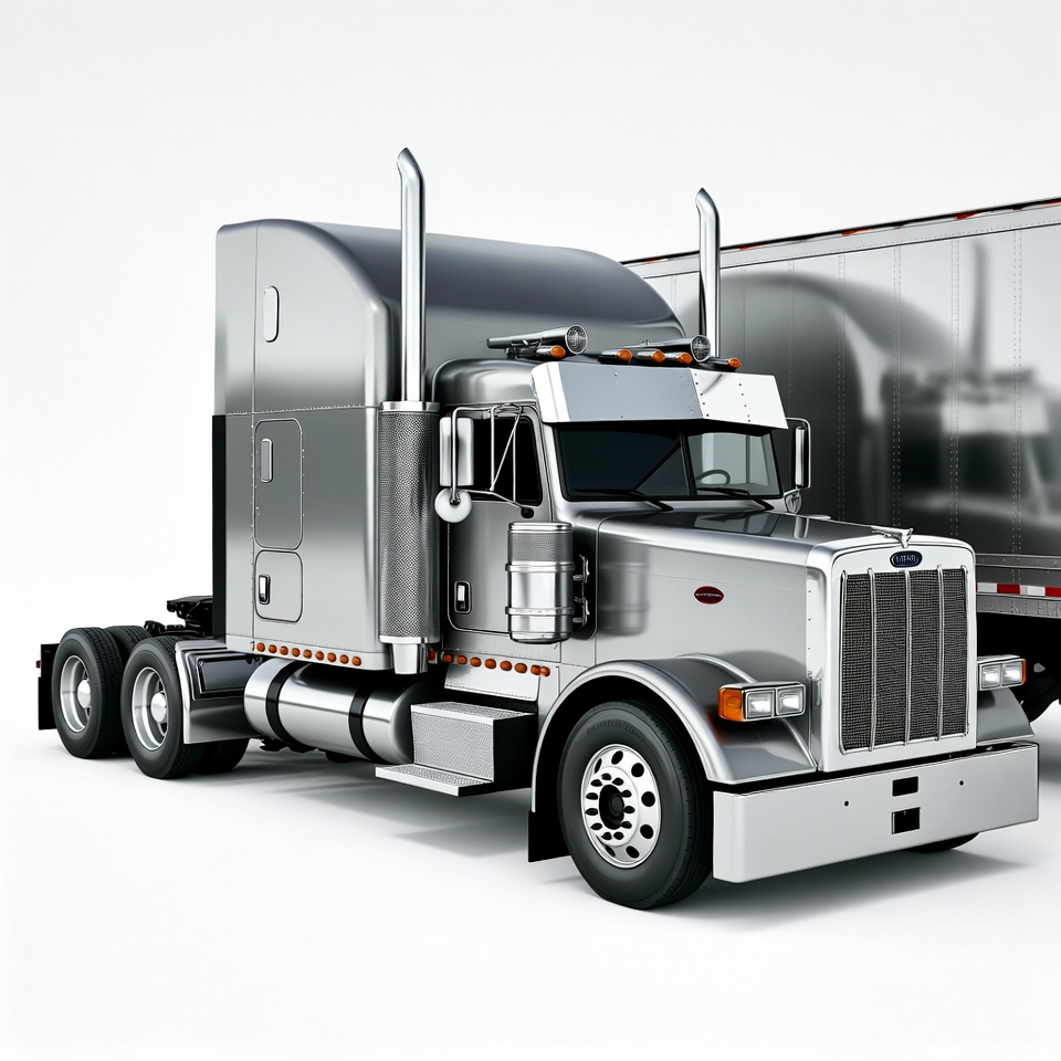 18-wheeler, 3D render, CGI truck, Peterbilt truck, big rig, chrome truck, commercial vehicle, dual wheels, exhaust stacks, freight truck, grille, headlights, heavy truck, highway truck, isolated background, lorry, semi-trailer, silver truck, tractor trailer, transport truck, truck, white background, semi truck