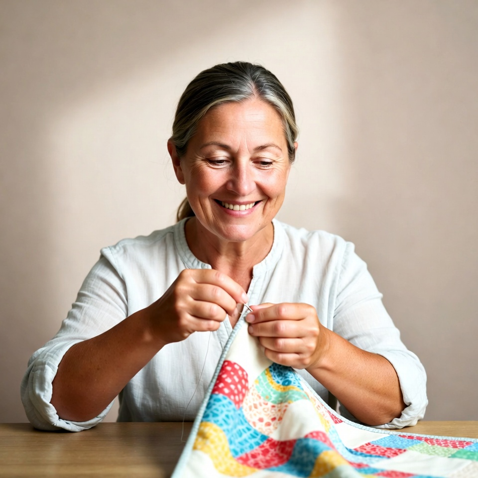White, beige background, blonde hair, colorful quilt, crafting, female, gray hair, handmade, hands sewing, middle-aged, needle, patchwork quilt, quilt, sewing, smiling, thread, vibrant colors, white shirt, wooden table, woman