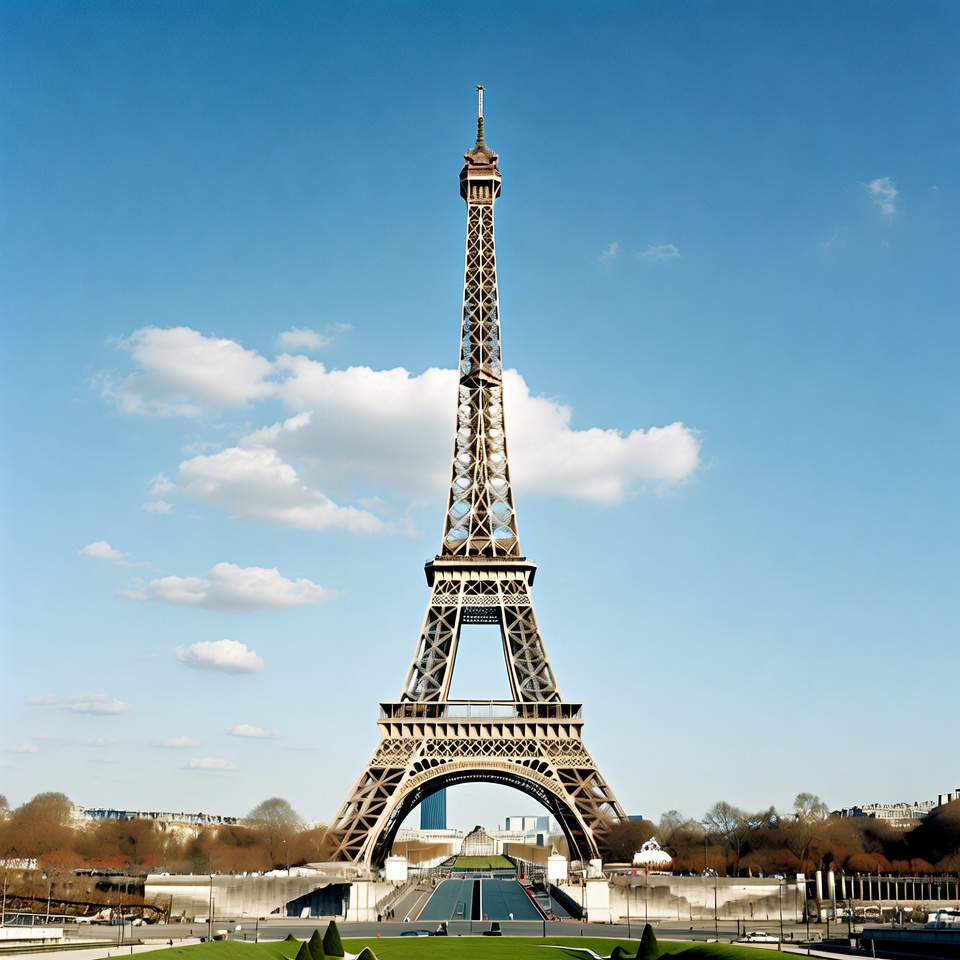 Champ de Mars, France architecture, Paris landmark, Seine River, autumn trees, blue sky, clouds, green lawn, iron tower, landmark, metal lattice, sunny day, tall structure, travel icon, Eiffel Tower