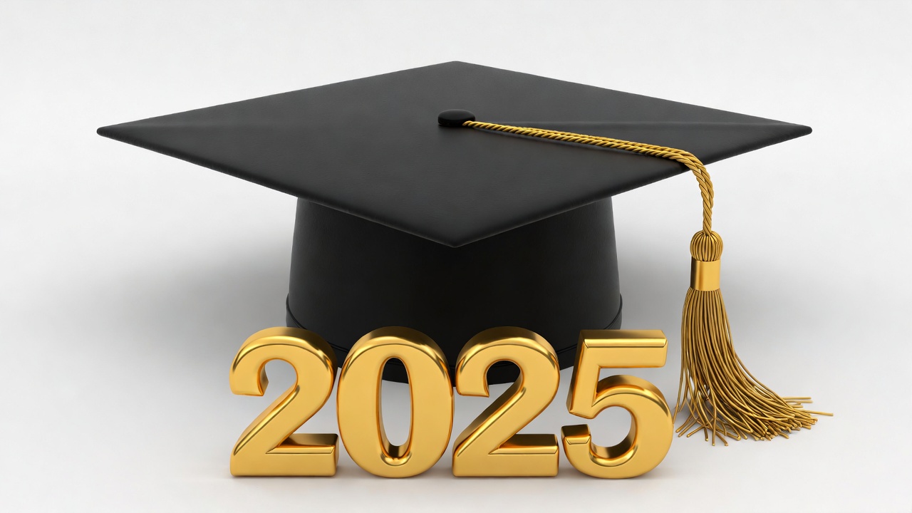 2025, 3D render, academic, achievement, clipart, gold numbers, golden tassel, graduation, illustration, isolated background, mortarboard, shiny gold, year 2025, graduation cap