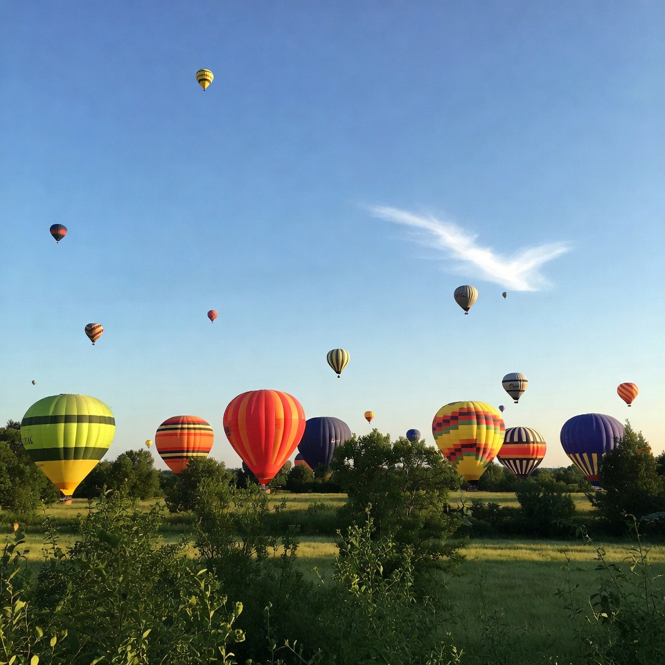 aerial view, balloon festival, balloons flying, blue balloon, blue sky, colorful balloons, contrail, field landscape, floating balloons, grass, green balloon, green field, orange balloon, red balloon, sky, trees, vibrant colors, yellow balloon, hot air balloons