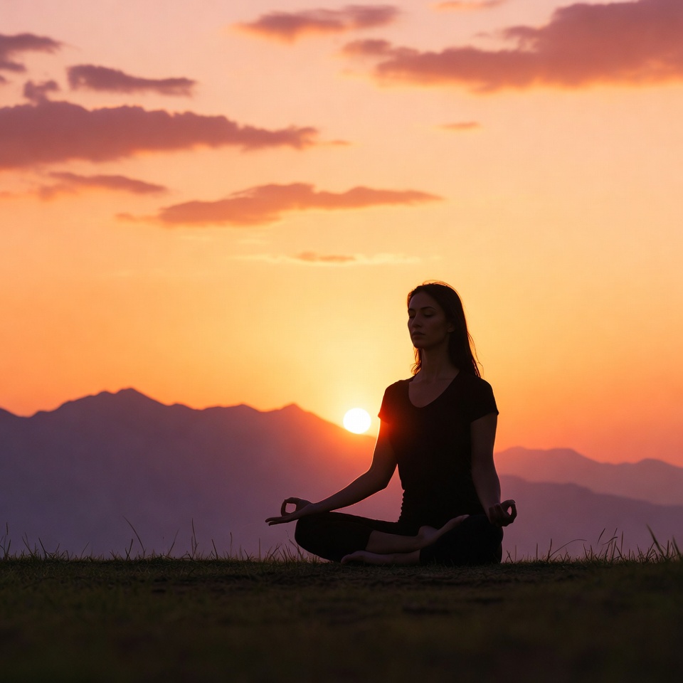 A silhouette of a woman with long hair sits in lotus pose on grass, performing yoga meditation. She wears a t-shirt and leggings with hands in mudra position. A vibrant orange sunset glows behind her with mountains and clouds in the background.