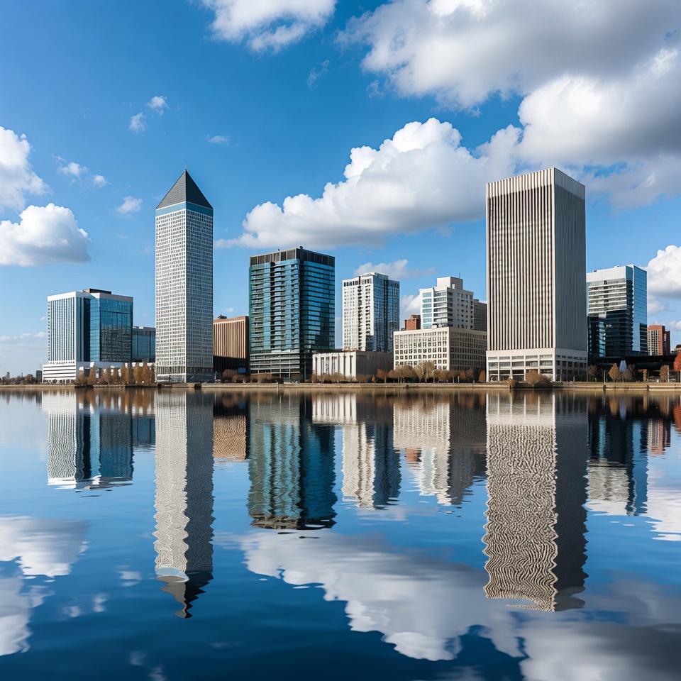 architecture, blue sky, cityscape, downtown, glass towers, high-rises, lake reflection, mirror image, modern buildings, skyscrapers, tall buildings, urban landscape, water reflection, waterfront, white clouds, city skyline