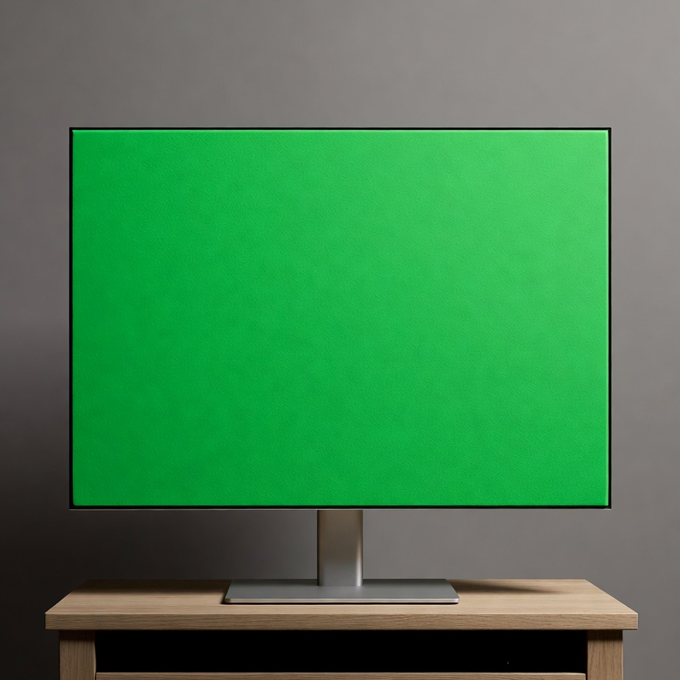 LCD screen, LED display, chroma key, display, electronics, flat screen, gray background, green screen, isolated background, monitor, silver stand, studio setup, technology, television, video screen, wooden desk, TV monitor