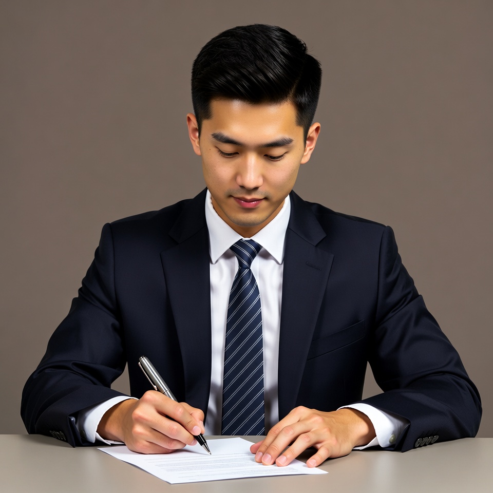 A young Asian man with short black hair sits at a table, wearing a dark navy suit, white shirt, and striped tie. He holds a pen in his right hand and signs a white document in front of him. The background is a plain gray studio setting.