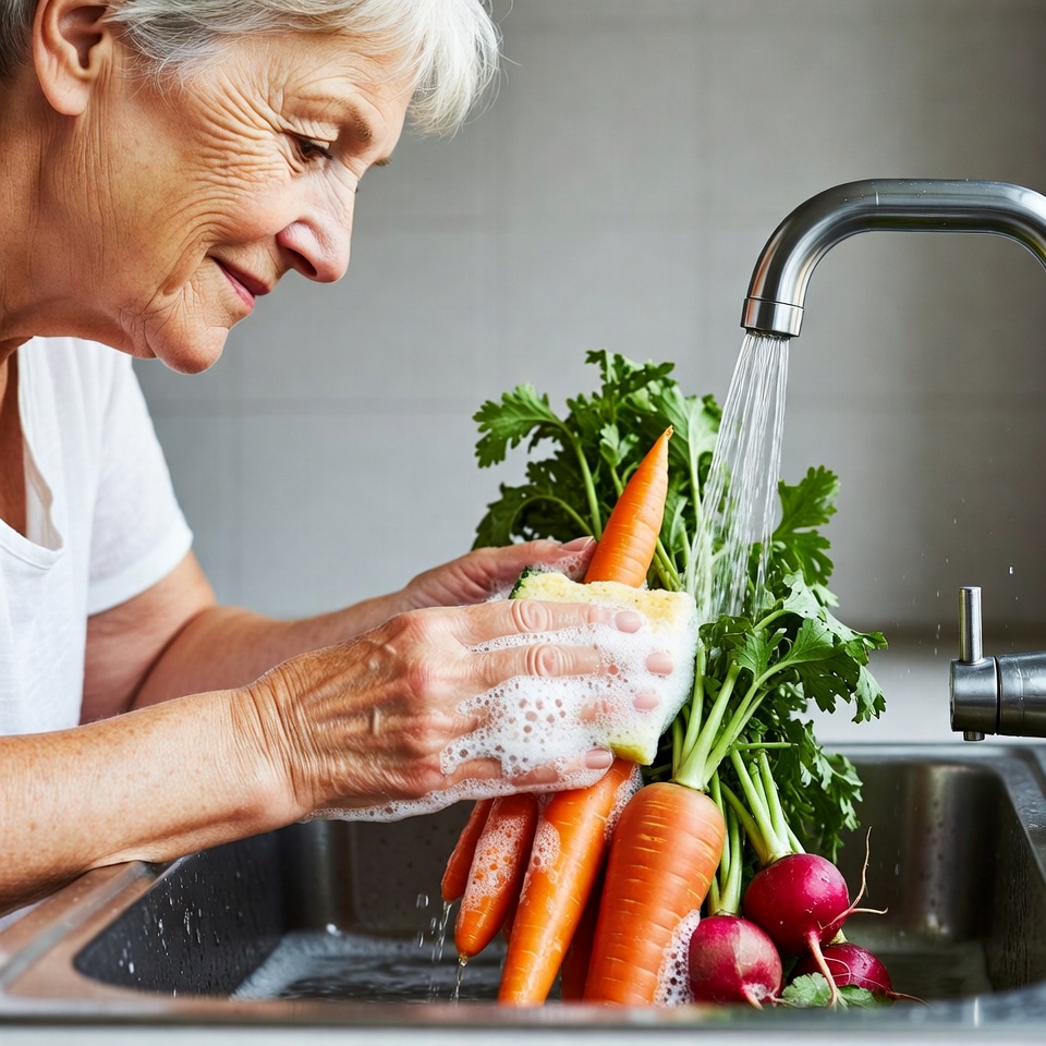 An elderly White woman with short gray hair washes carrots, beets, and greens under running water in a kitchen sink. She wears a white shirt and holds a yellow sponge while rinsing the fresh produce. The modern kitchen features a stainless steel sink and faucet.