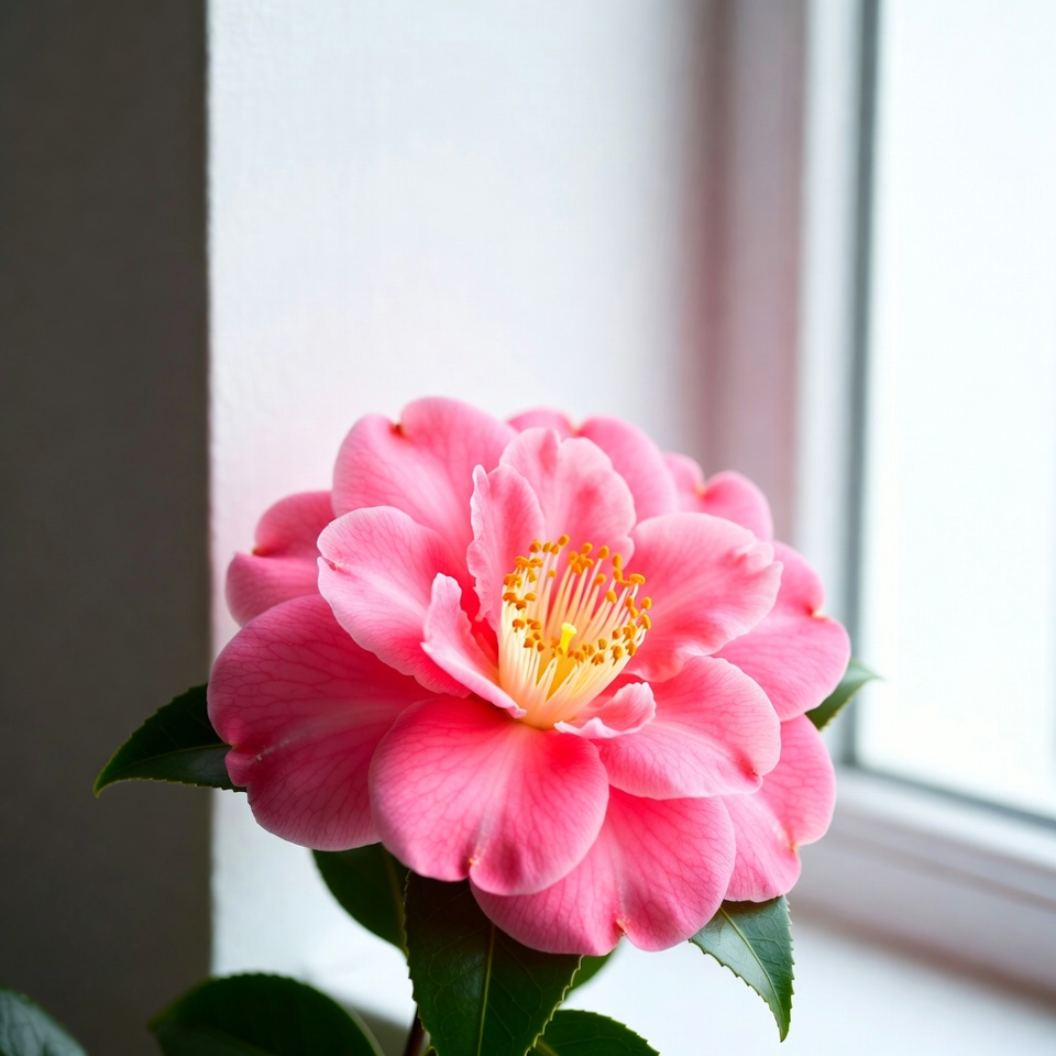 bloom, closeup, floral, flower, green leaves, isolated background, nature, petals, pink camellia, pink flower, plant, white wall, window, yellow stamens, camellia flower