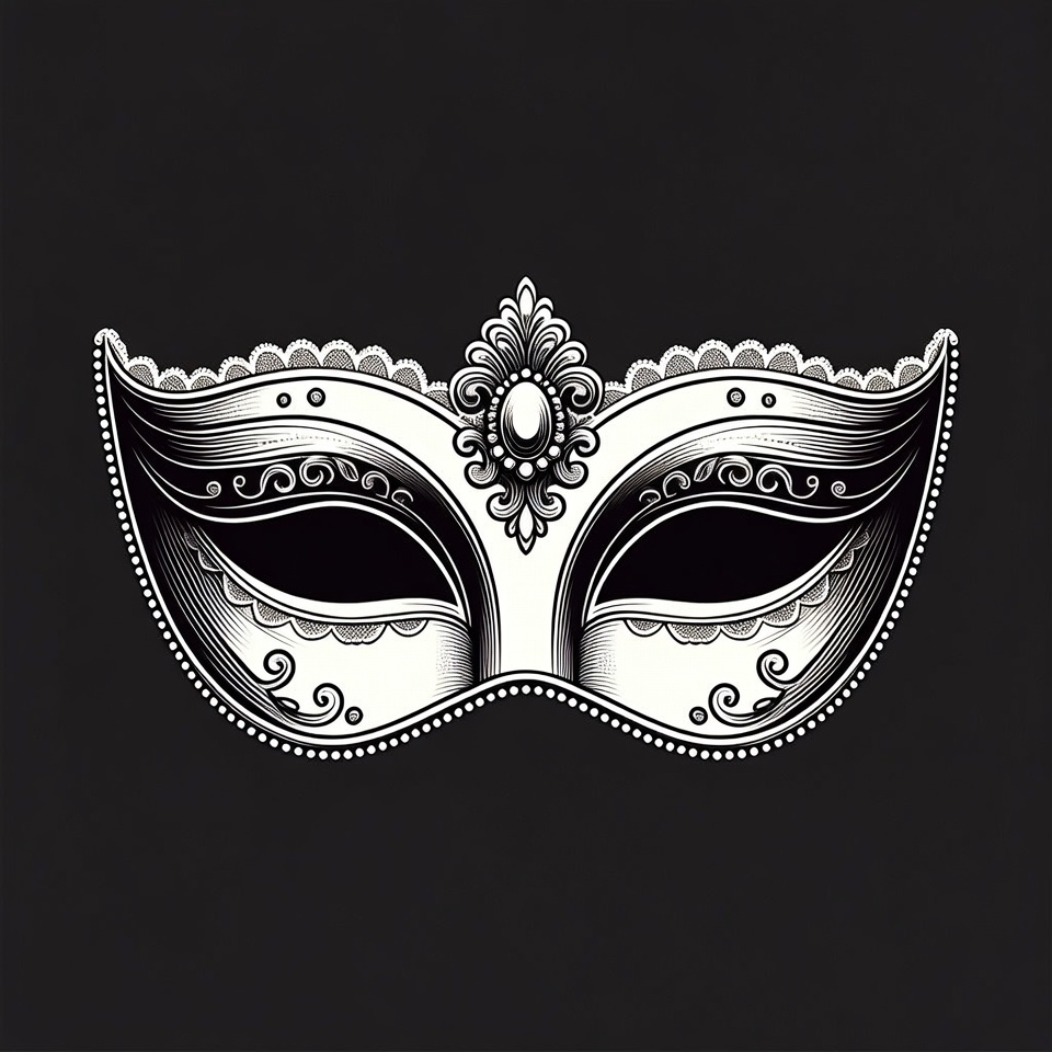 A detailed black and white illustration of an ornate Venetian masquerade mask. The mask features intricate lace edges, swirling filigree patterns, and a central oval gemstone. It is centered on a solid black background.