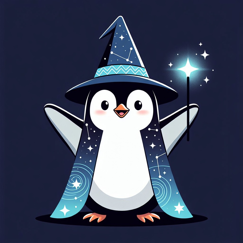 A chibi-style cartoon penguin dressed as a wizard wears a starry blue hat and cape. It holds a glowing wand with sparkling stars and stands with wings outstretched on a dark background. The adorable penguin has big eyes, a smiling mouth, and orange feet.