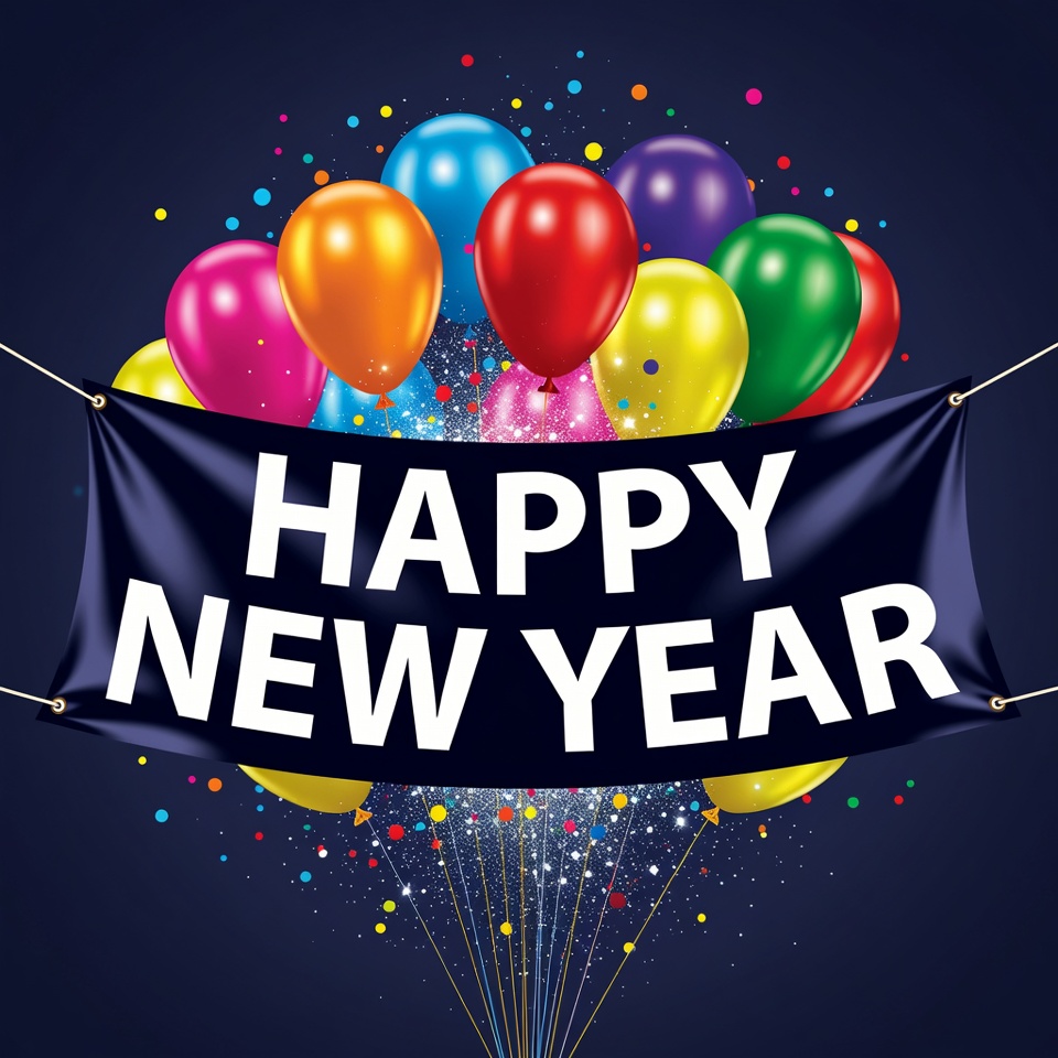 A vibrant illustration features a black banner with 'HAPPY NEW YEAR' in white text. Multicolored balloons in red, blue, yellow, purple, orange, pink, and green surround the banner. Confetti and strings hang from the balloons against a dark blue background.