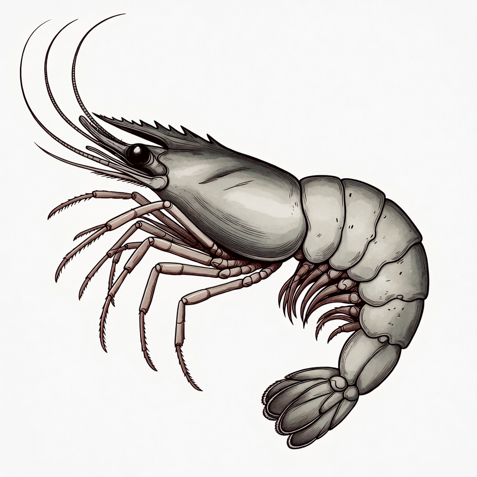 antennae, clipart, detailed drawing, exoskeleton, illustration, isolated background, legs, line art, marine animal, prawn, seafood, tail, vector art, white background, shrimp
