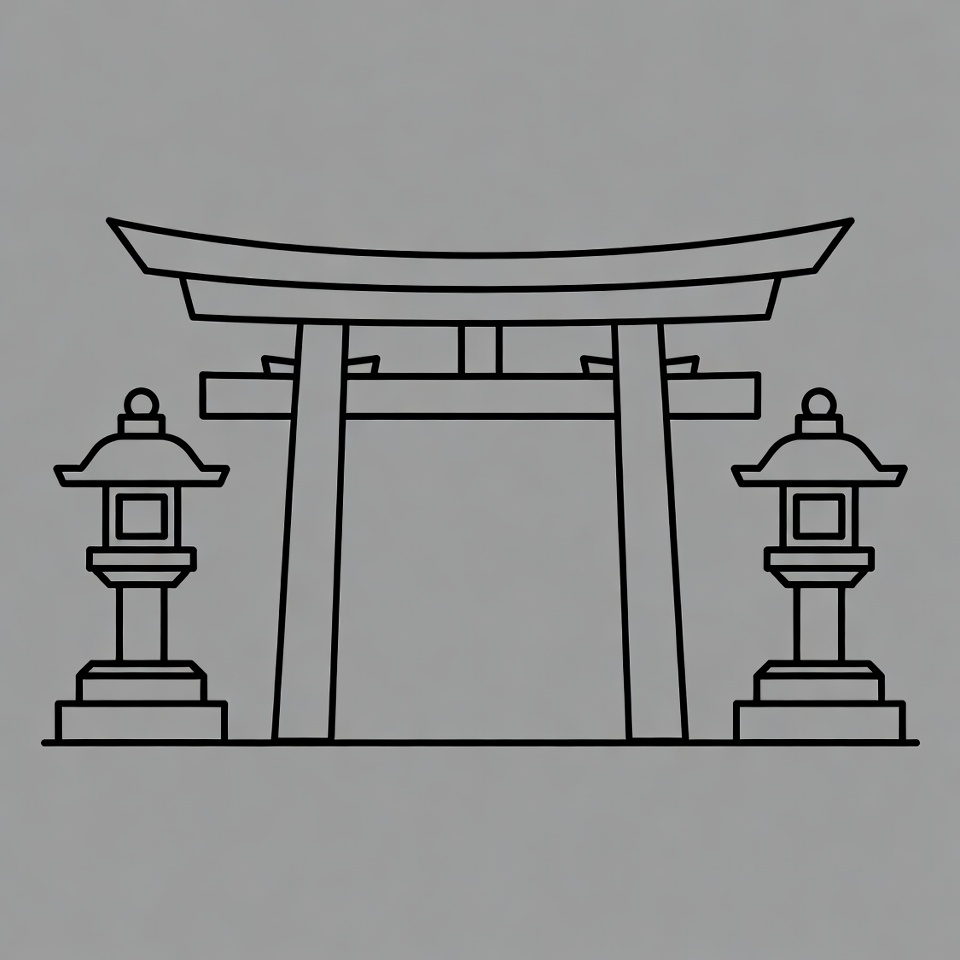 A black line art illustration of a traditional Japanese torii gate stands prominently on a gray background. Flanked by two stone lanterns with curved roofs on either side, the design features clean outlines and minimal shading. The composition is symmetrical and isolated.