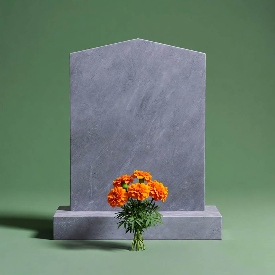 3D render, bouquet, cemetery, flowers, funeral flowers, gravestone, gray stone, green background, headstone, isolated background, marigolds, memorial, orange flowers, tombstone