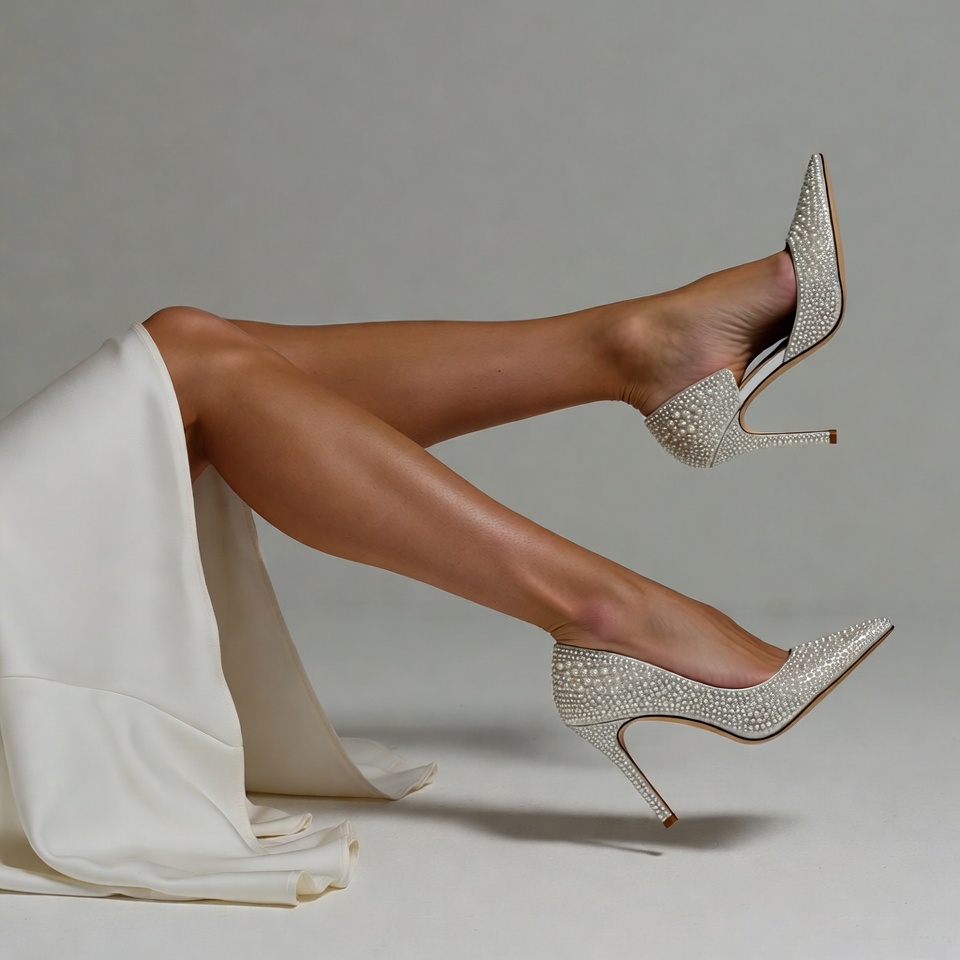 beaded heels, crossed legs, dress, elegant footwear, fashion, feet, female, high heels, isolated background, legs, luxury shoes, sparkly shoes, stilettos, studio shot, toned legs, white dress, white heels, woman