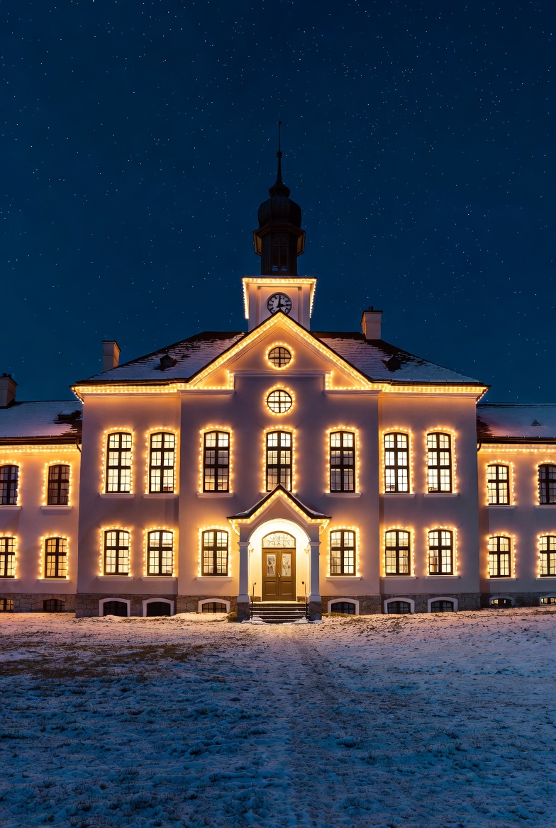 architecture, clock tower, cold weather, estate, european architecture, facade, front door, historic building, illuminated building, landmark, lights, mansion, night sky, outdoor, path, roof snow, snow, snowy night, stars, white building, windows, winter, manor house