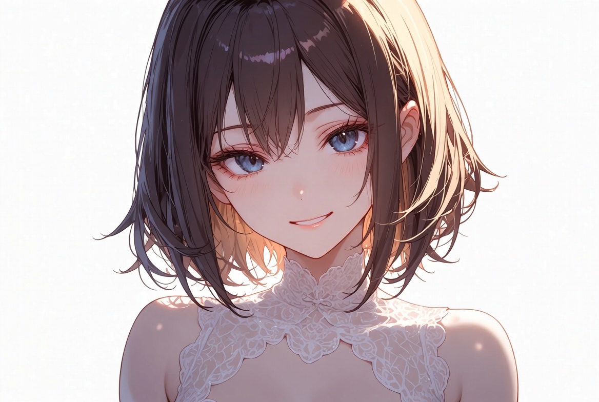 anime, blue eyes, brown hair, close-up, cute girl, detailed eyes, female, girl, high collar, illustration, isolated background, lace dress, manga style, portrait, smiling, soft lighting, white dress, young woman, anime girl