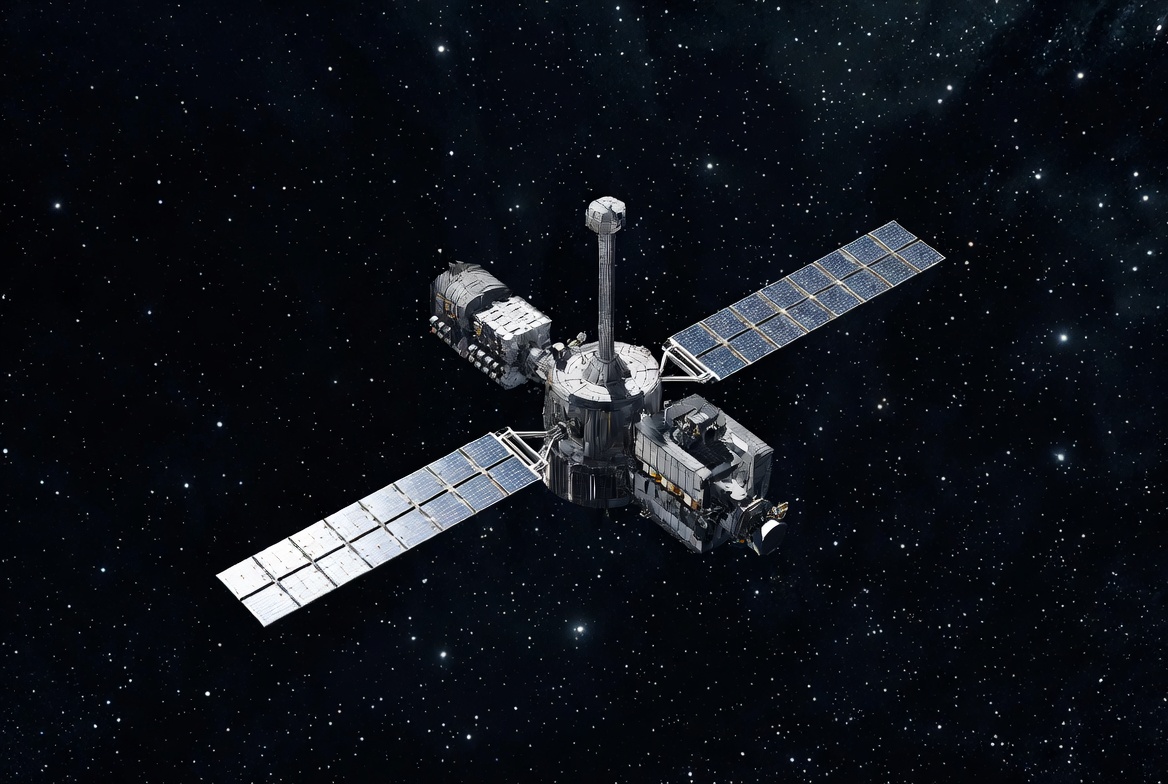 A detailed 3D model of a space station with large solar panels extended on both sides floats in deep space. The central module features multiple docked components and a tall antenna structure. Stars sparkle in the black cosmic background.