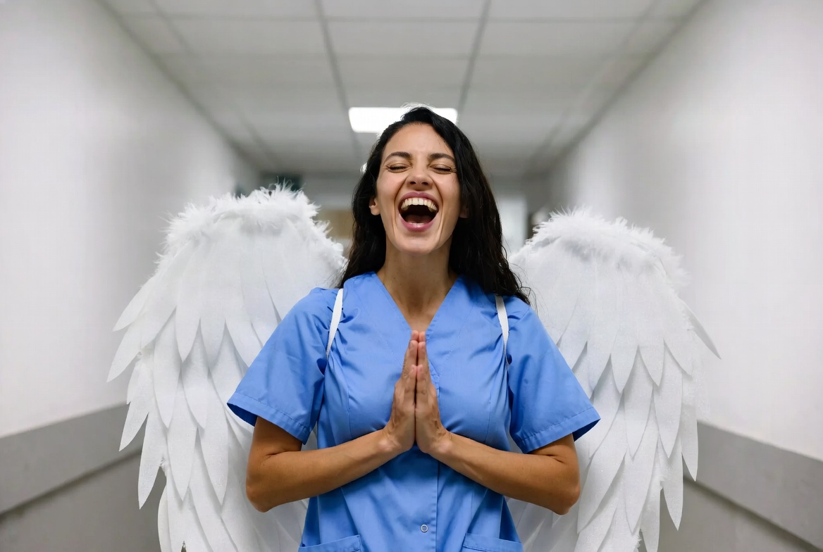 Latina, angel wings, angelic nurse, blue scrubs, dark hair, female, healthcare worker, hospital corridor, hospital hallway, joyful nurse, laughing, medical uniform, prayer gesture, praying hands, smiling, white wings, wings, woman, nurse