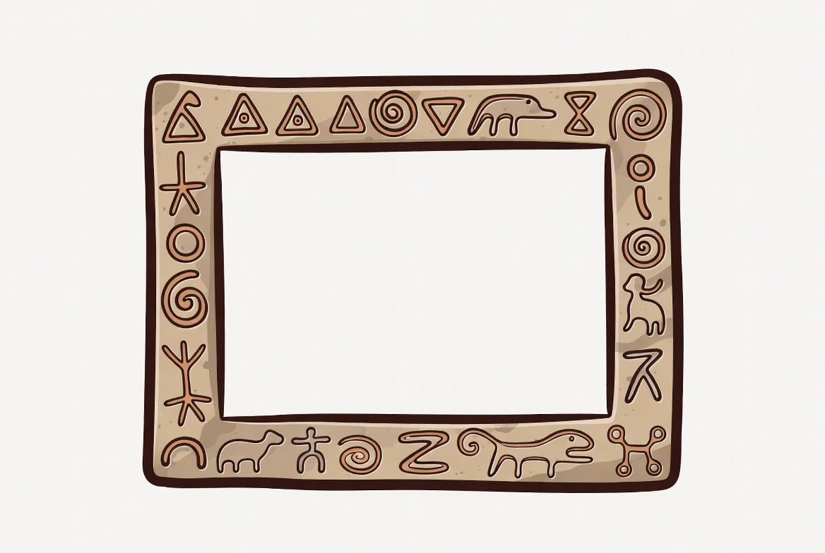 abstract shapes, ancient symbols, bear symbol, beige frame, cave painting style, clipart, decorative border, empty frame, glyph border, goat symbol, hieroglyphs, illustration, isolated background, line art, petroglyphs, prehistoric art, runes, spiral, triangle, tribal art, primitive frame