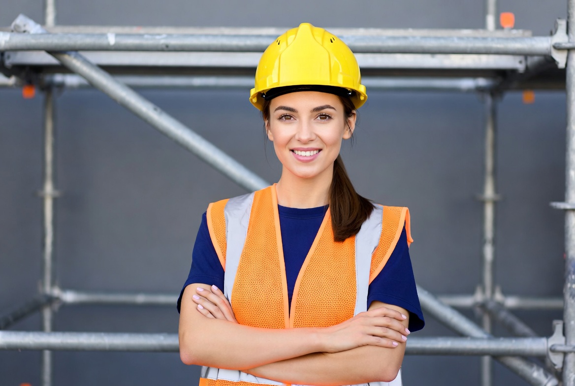 A smiling woman with dark hair in a ponytail wears a yellow hard hat and orange safety vest over a blue shirt. She stands confidently with arms crossed in front of metal scaffolding on a gray background. Her expression is positive and professional.