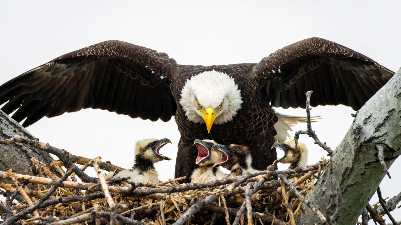 A majestic bald eagle with widespread wings stands protectively over its nest. Four fluffy eaglets with open beaks reach up toward the parent. The nest is constructed from twigs and branches against a blurred natural background.