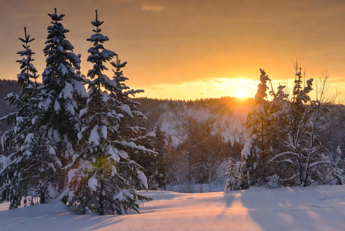 cold weather, evergreen trees, fir trees, forest, golden hour, hills, mountains, nature, orange sky, outdoors, pine trees, scenic view, shadows, snow, snowy path, sun rays, sunset, winter landscape, winter scene, snowy trees