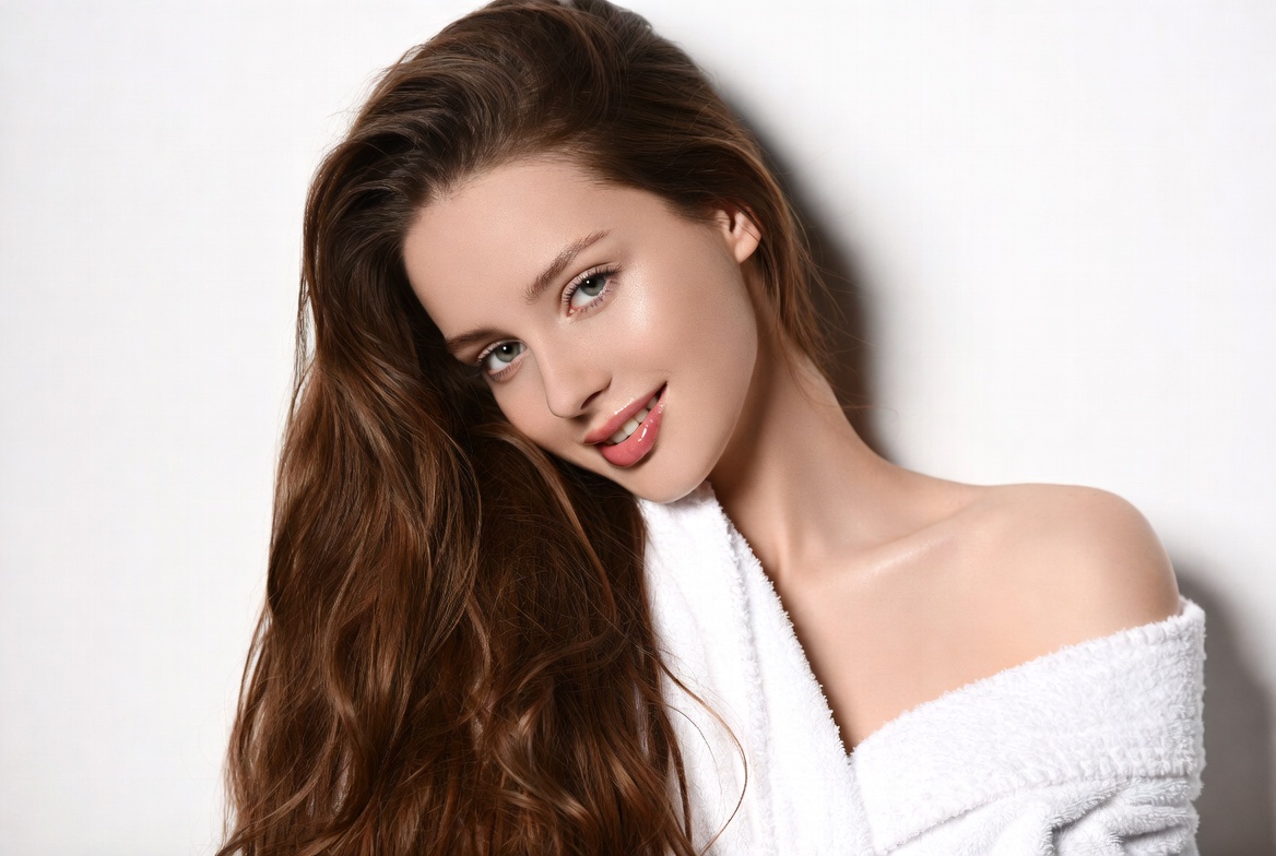 A young woman with long wavy brown hair smiles softly at the camera. She wears a fluffy white bathrobe slipped off one shoulder, revealing her collarbone. She poses against a plain white background with a subtle head tilt.