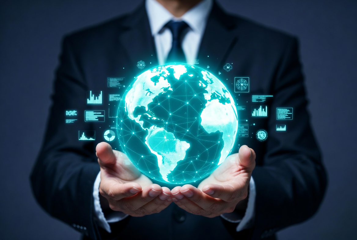 A man in a dark suit holds a glowing blue digital globe in his hands against a dark background. The globe features holographic charts, graphs, and network lines overlaying the continents. He stands with hands cupped around the futuristic Earth representation.