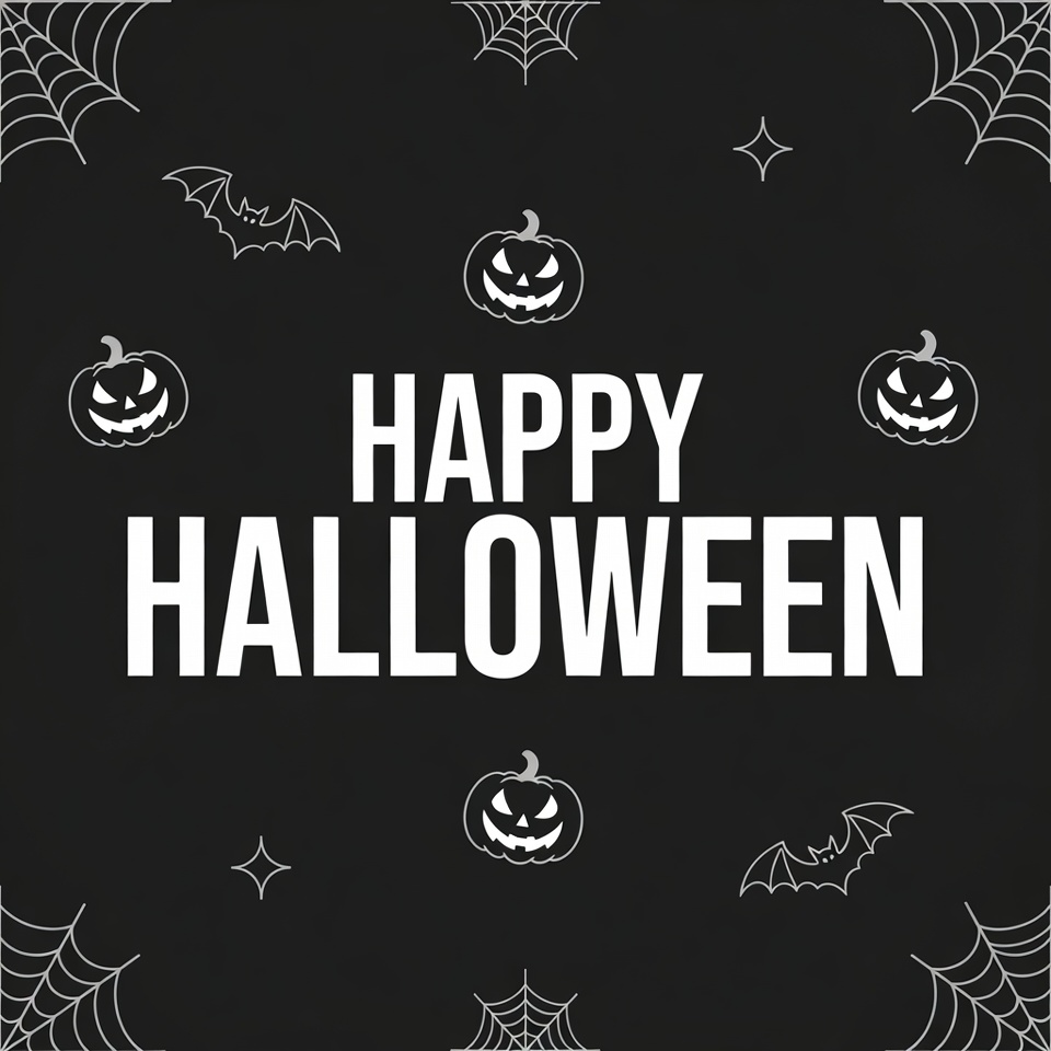 A black square illustration features bold white 'Happy Halloween' text centered on a dark background. Surrounding elements include white spider webs framing the edges, floating jack-o'-lantern pumpkins with carved faces, bats, and sparkling stars. The design is simple and festive with metallic white outlines.
