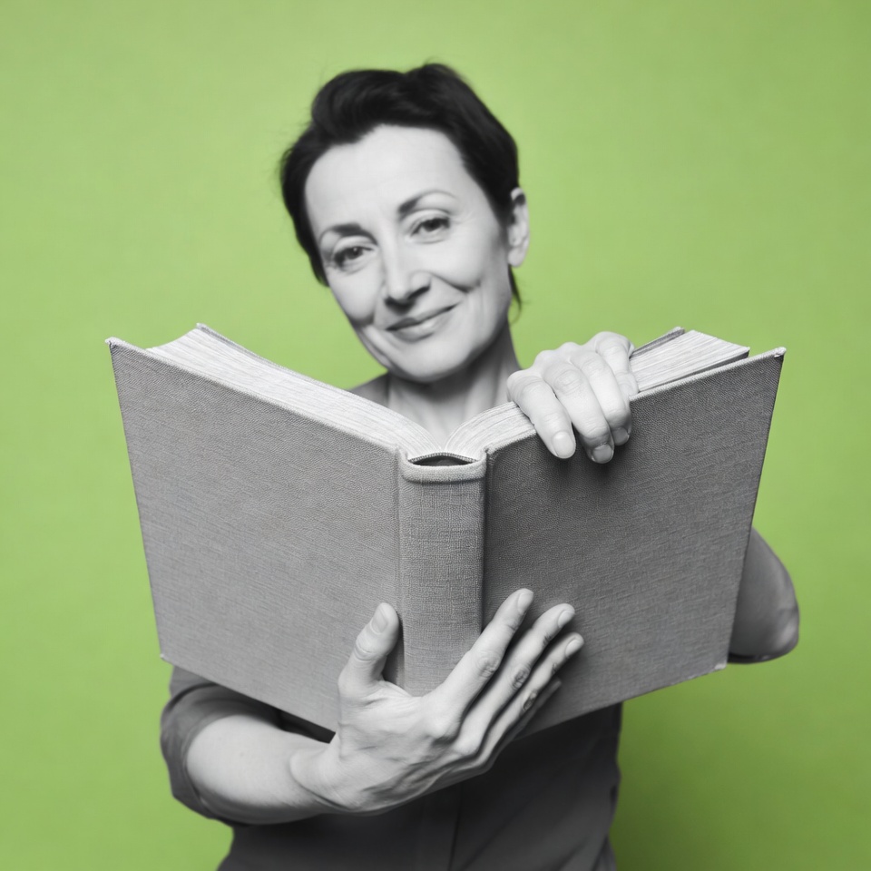 A smiling woman with short dark hair holds a large open book in front of her against a bright green background. She grips the book with both hands, her fingers visible on the edges of the pages. She wears a dark long-sleeved top and looks directly at the camera.
