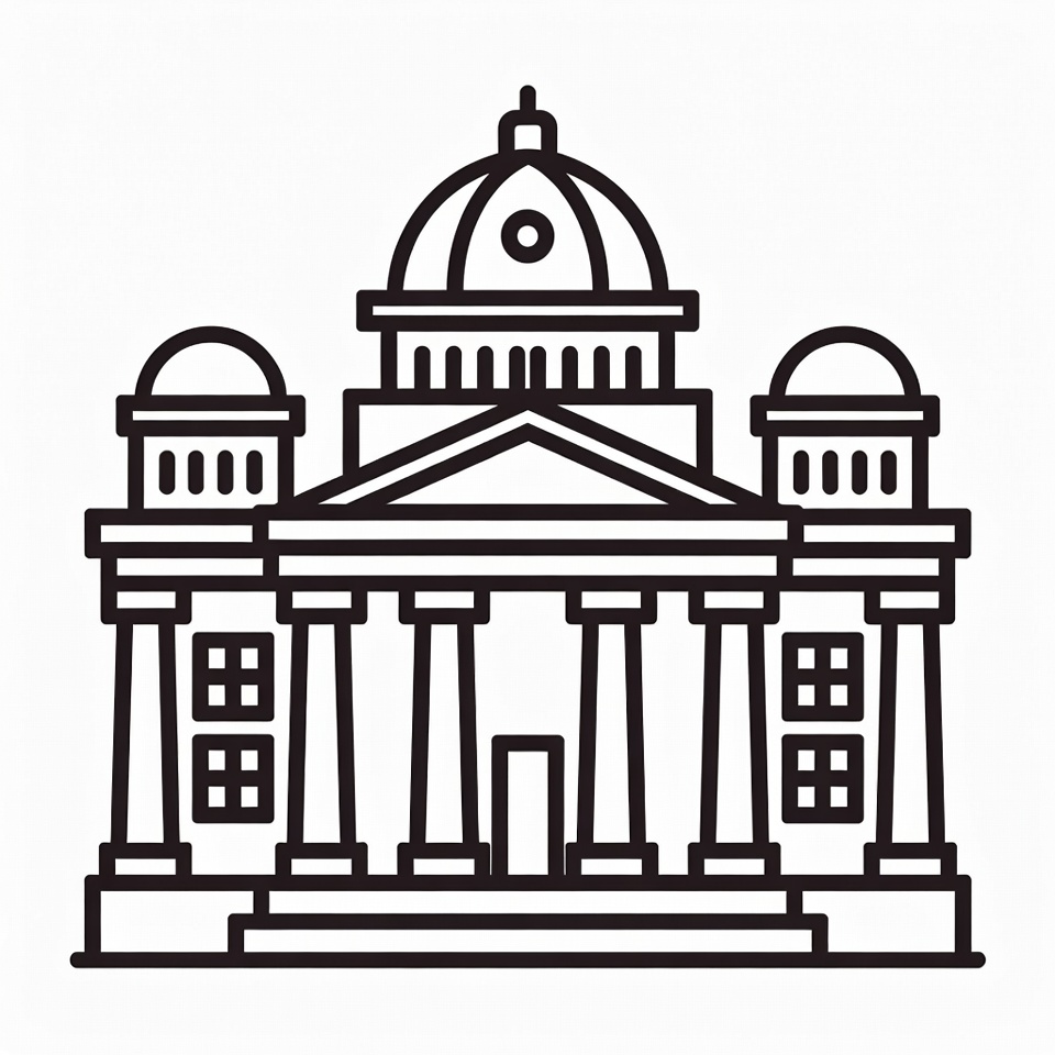 architecture, black lines, clipart, columns, dome, drawing, finial, government building, grand building, illustration, isolated background, landmark, line art, neoclassical, outline, steps, vector, white background, windows, capitol building
