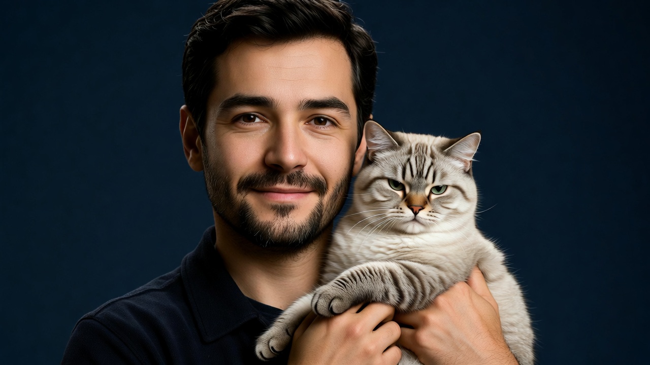 A young man with dark hair and a beard smiles while holding a light gray tabby cat close to his chest. He wears a dark polo shirt, and the cat gazes forward with green eyes. The image is set against a solid dark blue background.