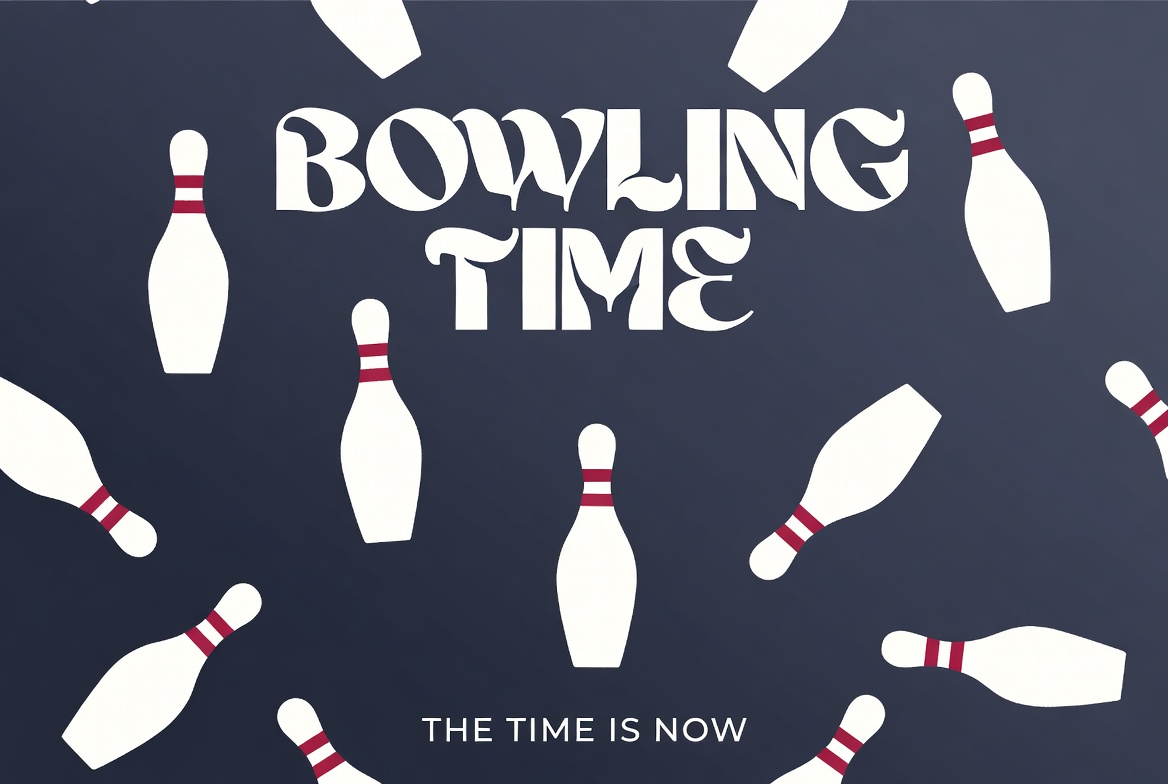 activity, bowling time, clipart, dark background, design, fun, game, graphic, illustration, isolated background, pins, red stripes, signage, sport, text, vector, white pins, bowling