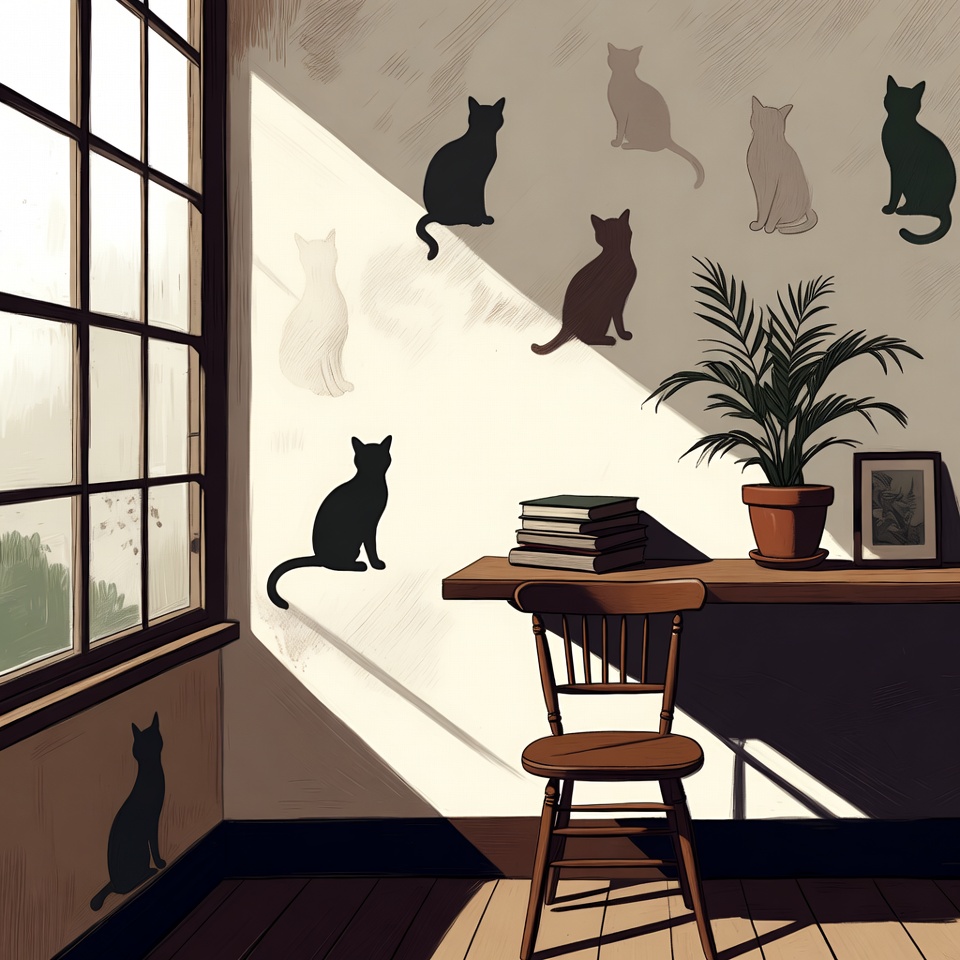 An illustration shows multiple black cat silhouettes on a light beige wall near a large window with sunlight streaming in. A wooden desk holds stacked books, a potted fern plant, and a small framed photo. An empty wooden chair sits beside the desk on a wooden floor.