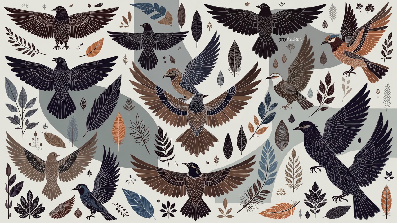 A collection of dark-colored birds in various flying poses is illustrated against a light background. The birds feature shades of black, brown, and rust, surrounded by scattered autumn leaves and ferns in green, orange, and beige tones. The artwork has a flat, graphic style with intricate feather details.