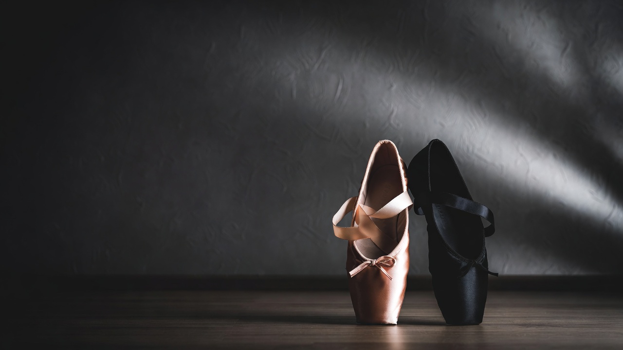 A pair of ballet pointe shoes, one pink and one black, stands side by side on a wooden floor. They feature satin ribbons tied around the ankles and are positioned against a dark gray background with subtle light rays. The shoes are displayed isolated with no people present.