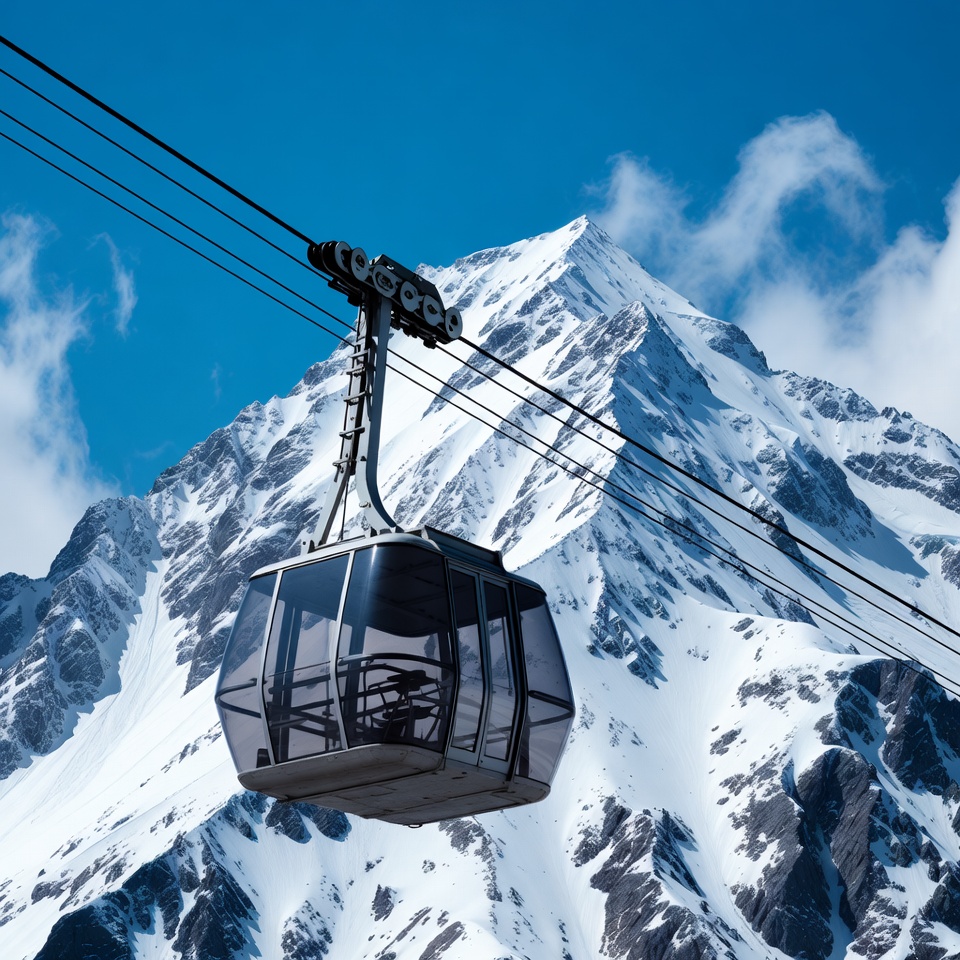 aerial tramway, alpine, blue sky, clouds, empty gondola, glass cabin, gondola, mountain landscape, mountains, peak, ridge, ski lift, ski resort, snow, snowy mountains, steel cables, winter, cable car