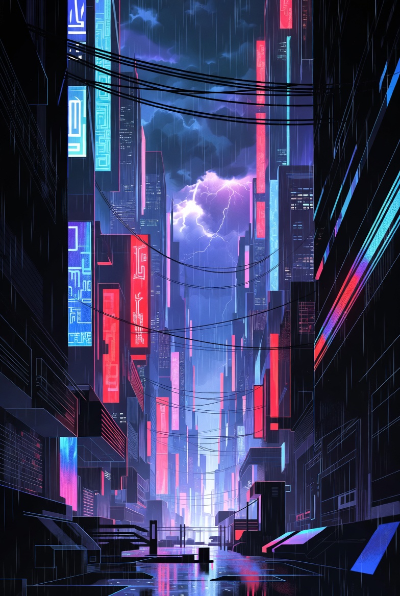 blue neon, cityscape, cyberpunk art, digital illustration, dystopian city, futuristic skyline, glowing buildings, illuminated signs, lightning storm, neon lights, neon signs, night scene, pink neon, power lines, puddles, purple neon, rainy night, rainy weather, red neon, reflections, sci-fi city, skyscrapers, thunderclouds, urban alley, vaporwave aesthetic, wet streets, cyberpunk city