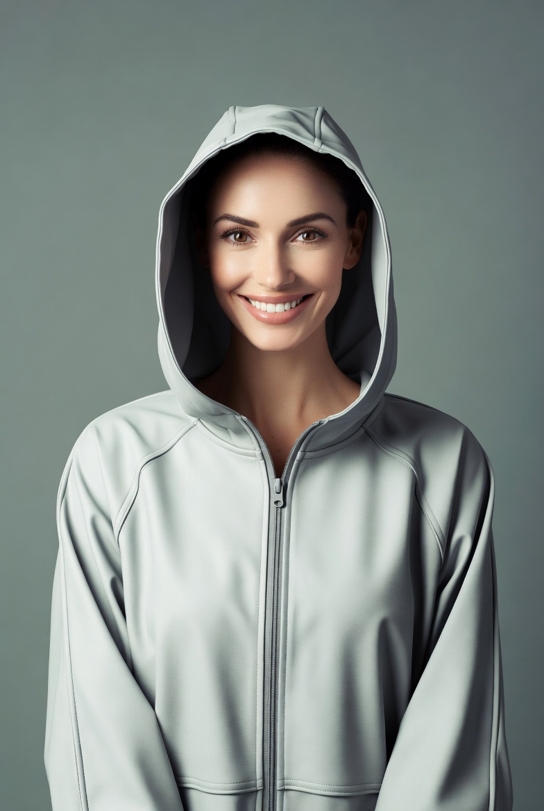 A young woman with dark hair smiles warmly while wearing a light gray hooded jacket with the hood up. She stands against a solid green-gray background, showcasing the shiny fabric of the zip-up hoodie. Her expression is friendly and approachable.