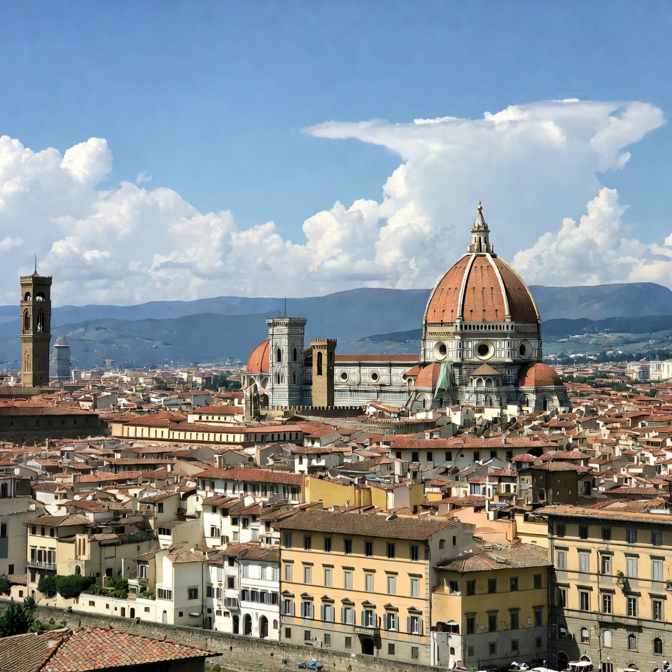 Aerial view of Florence, Italy, showcasing the iconic red-tiled Duomo with its prominent green-and-gold dome and bell tower. The cityscape features terracotta rooftops, historic buildings in warm hues of yellow and orange, and distant green hills under a partly cloudy blue sky.