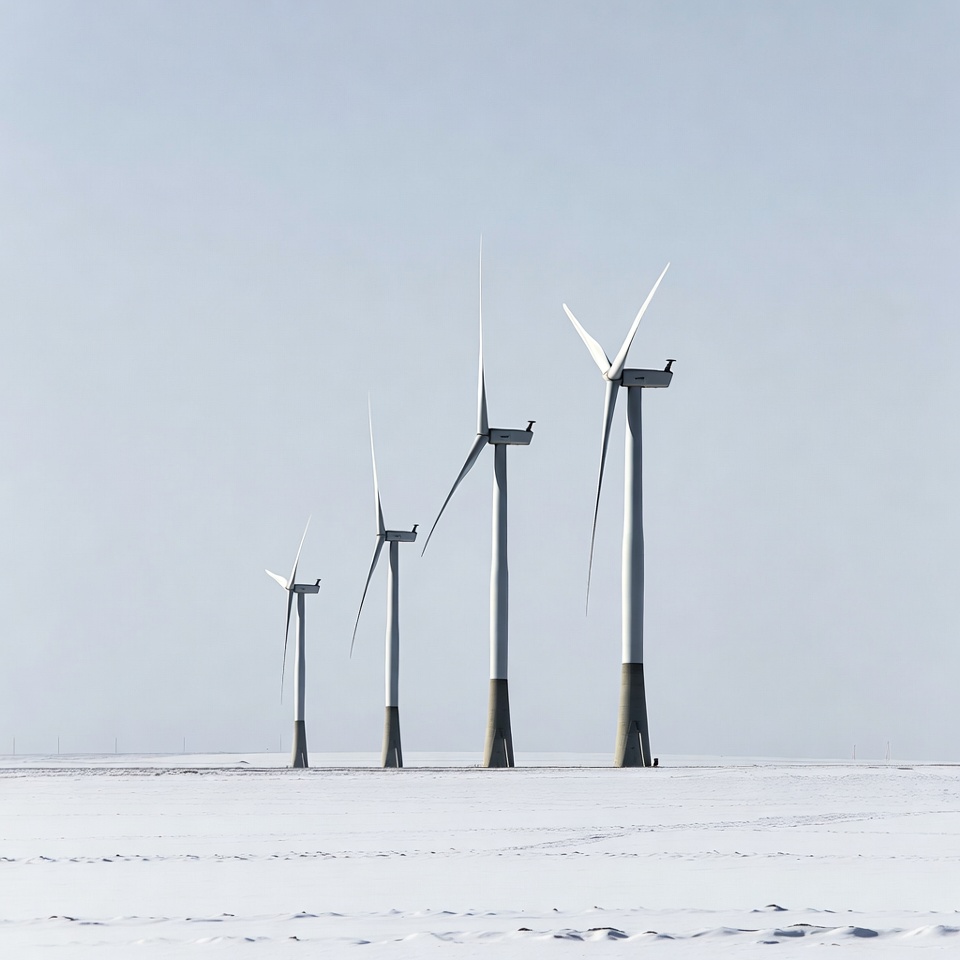 Several tall wind turbines with white blades stand in a row on a vast snowy plain. The sky is clear and pale blue, emphasizing the turbines against the flat, snow-covered ground. The bases of the turbines are gray and partially visible above the snow.